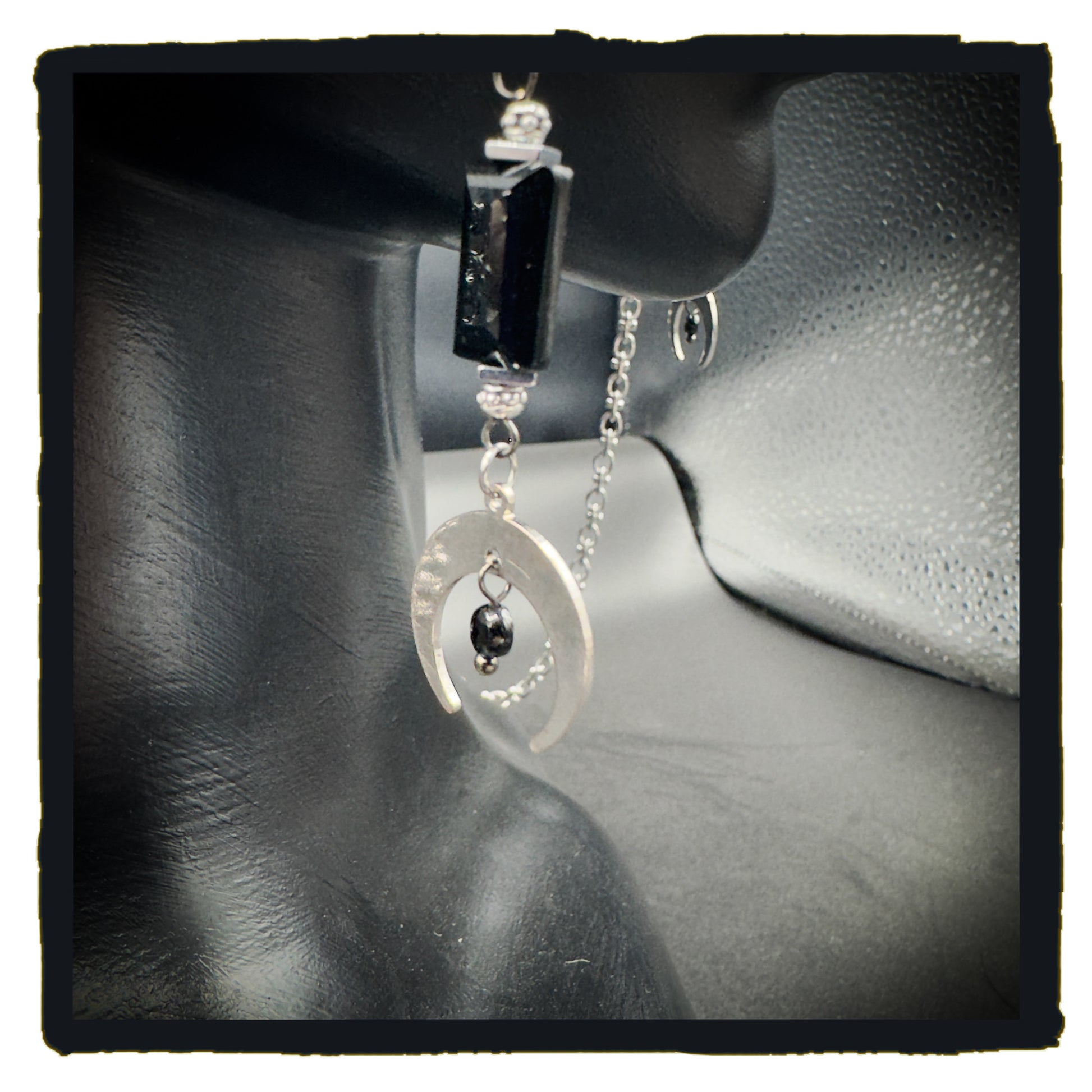 Silver rose connectors, black glass beads, silver beetle connectors and crescent moon charms with silver chain.