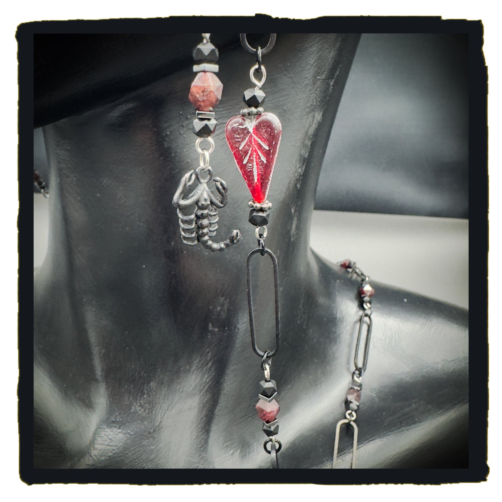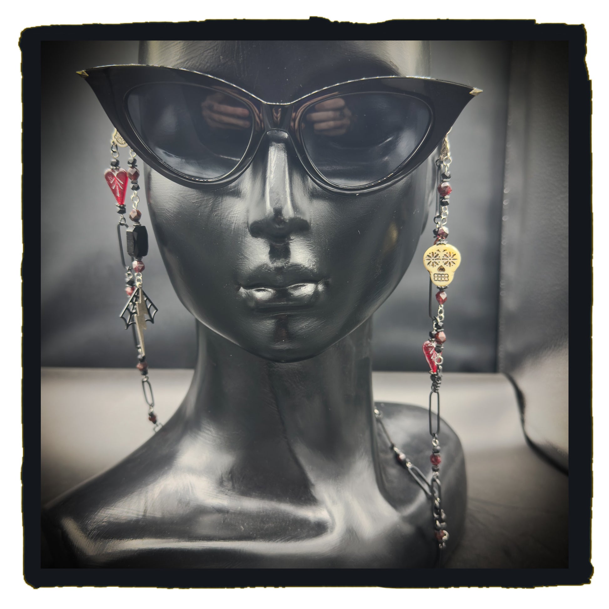 Handmade one of a kind eyewear chain features Czech glass skull bead, garnet beads, black oval connectors, lighting bolt charm, spiderweb charm and scorpion charm.