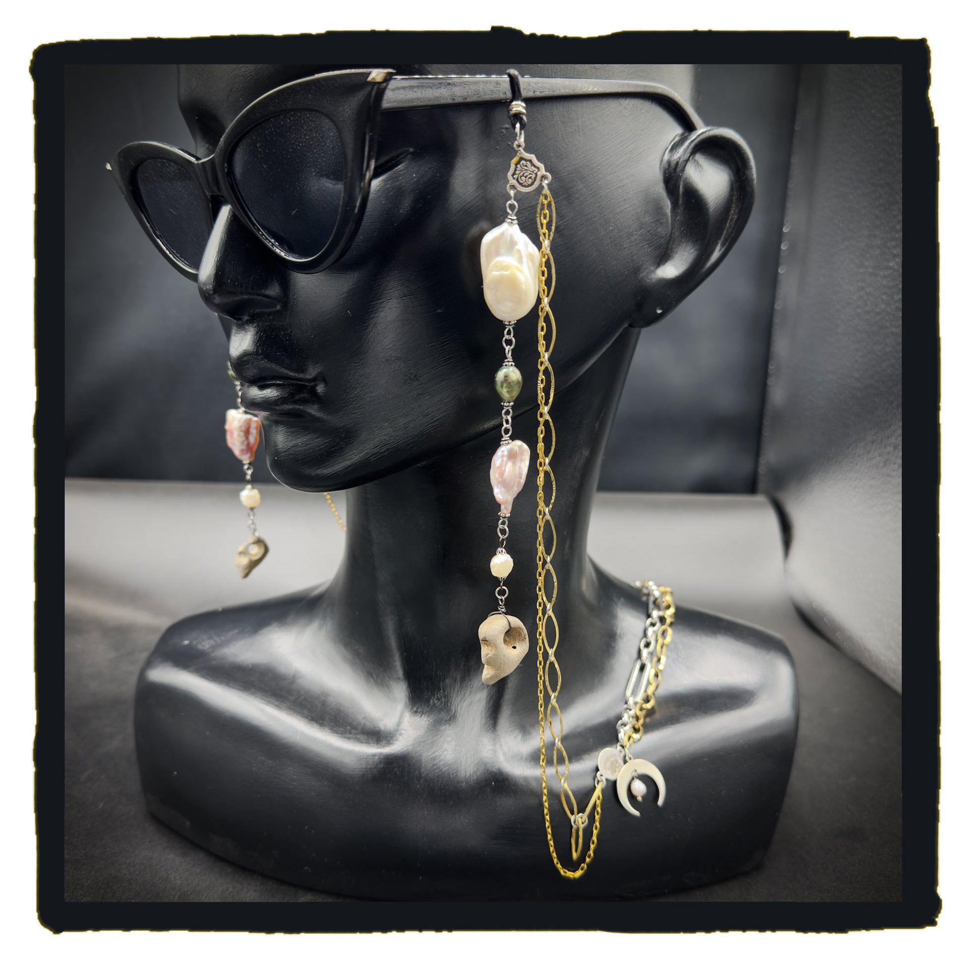 Handmade one of a kind eyewear chain features hag stones or adder stones I recovered from San Pedro, CA, as well as various pearl beads and mixed metals with gold and silver chains.
