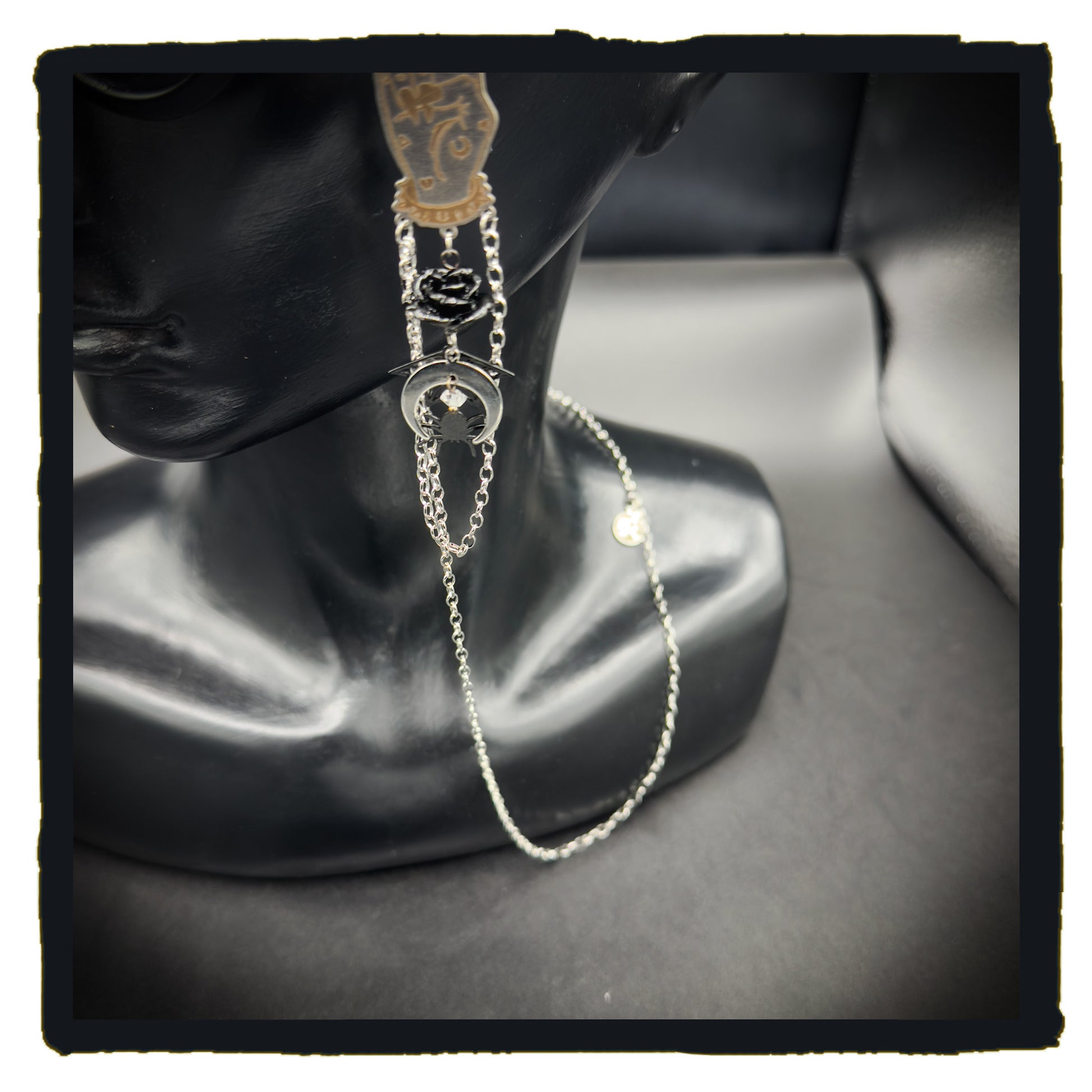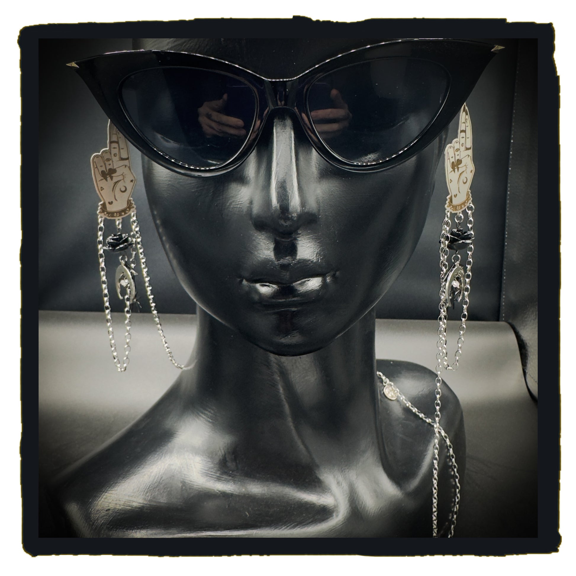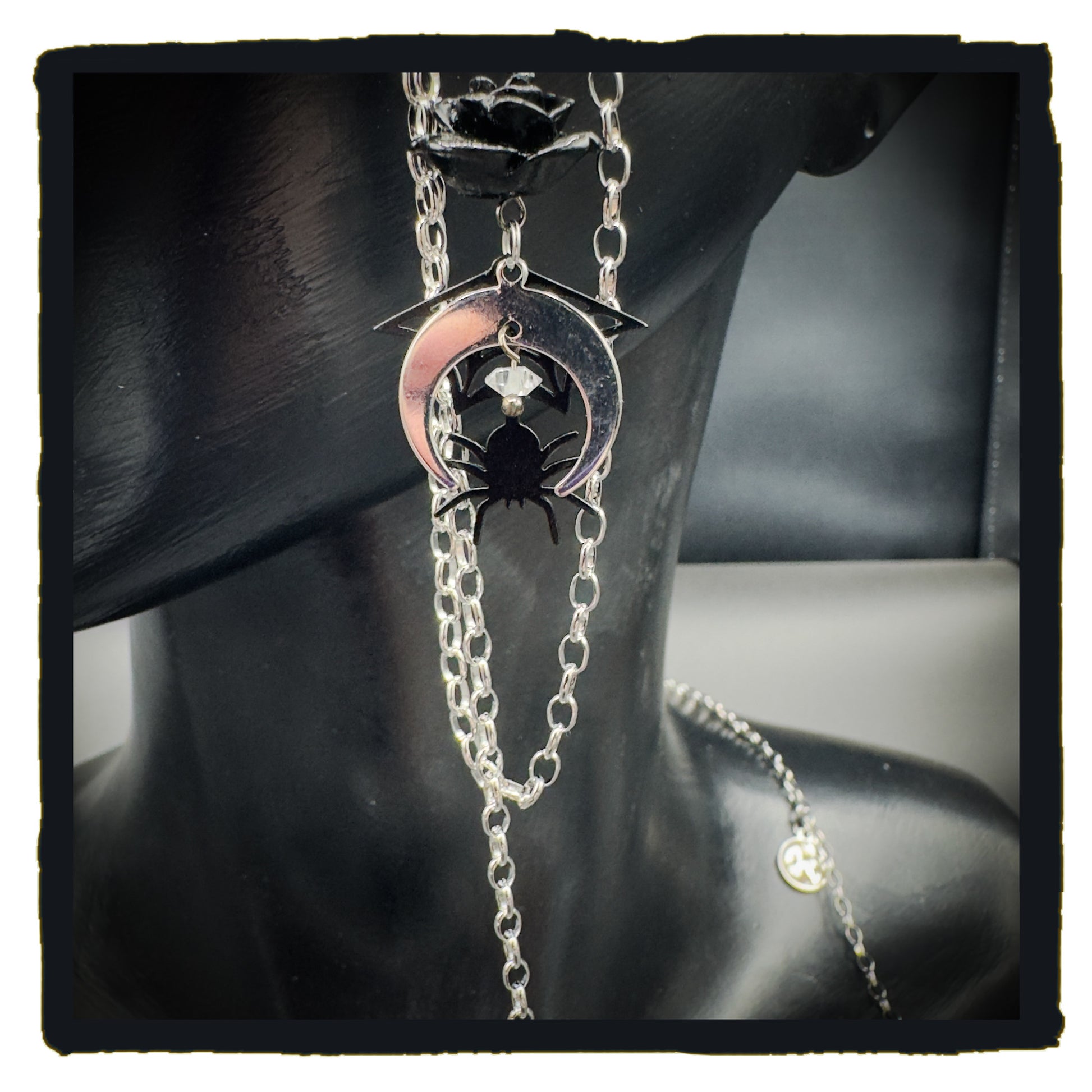 Handmade one of a kind eyewear chain features etched stainless steel witch hand connectors, black rose beads, herkimer diamond beads, silver moon charms, black spider charms and silver chains.